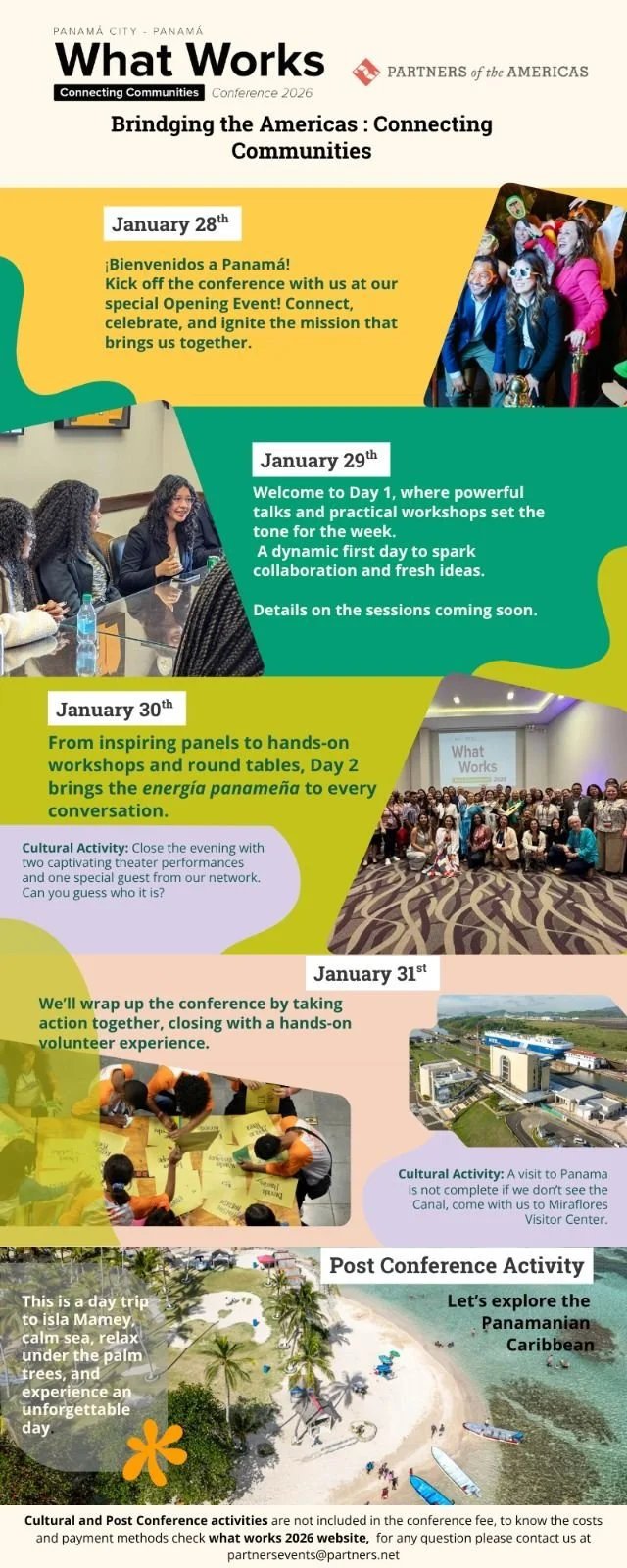 Join Partners of the Americas in Panama City, Panama, from January 28 to 31, 2026, for a unique conference which recognizes Partners of the Americas’ distinctive approach to bringing the right mix of players – volunteers, development professionals, governments, civil society organizations, and higher education institutions – to the table to match resources, knowledge, and passion to need. Along this line, the peace and development theme underscores a commitment to exploring the integral relationship between peacebuilding and sustainable development. The What Works Conference will provide meaningful, authentic, and positive international collaboration and community-building experiences for attendees that support the power of grassroots efforts of leaders and volunteers to take charge of the impact in their communities.